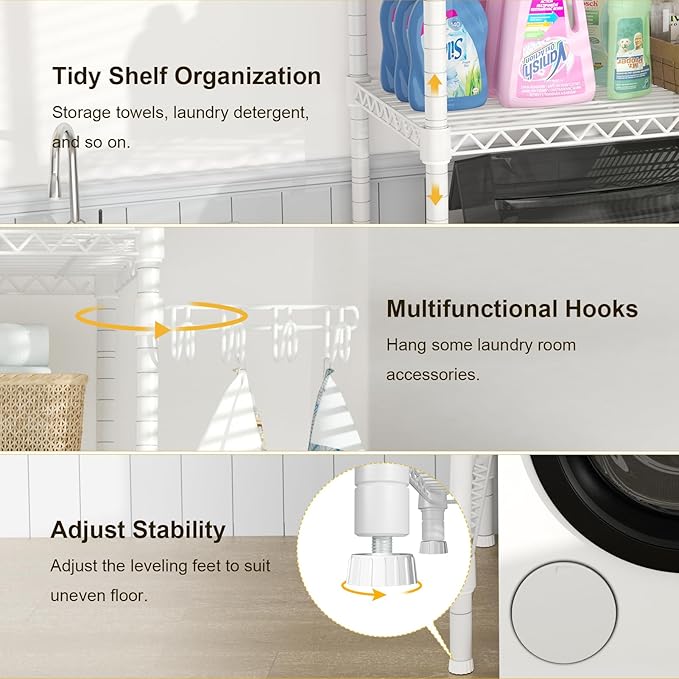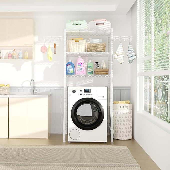 Estante organizador para lavadora diseñado para aprovechar el espacio vertical en lavanderías pequeñas. Su estructura ajustable y resistente permite colocar detergentes y productos de limpieza cómodamente. Es de fácil instalación y ayuda a optimizar espacios reducidos.