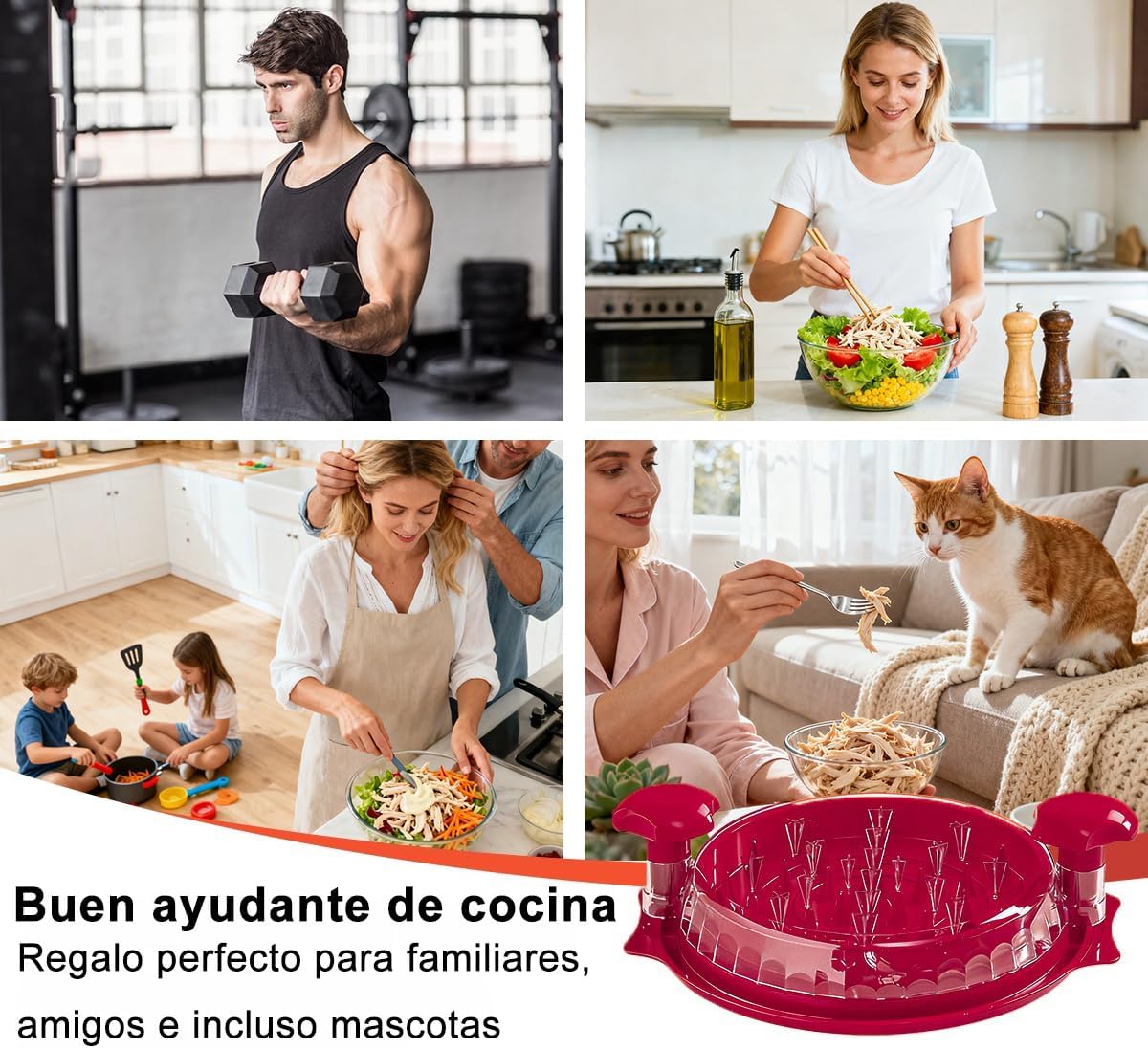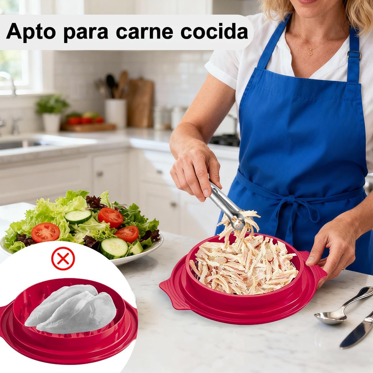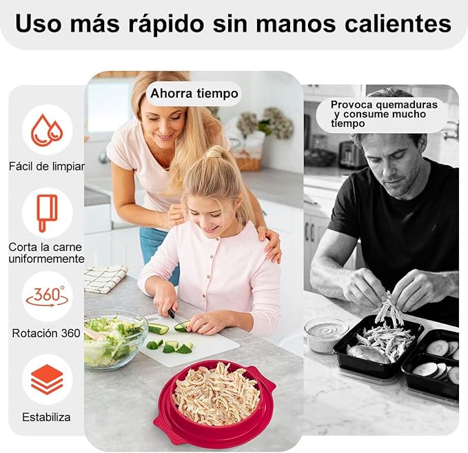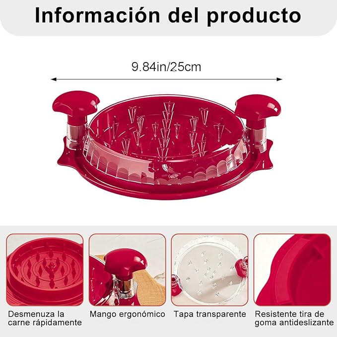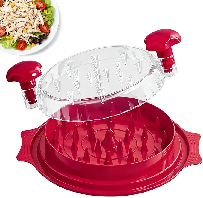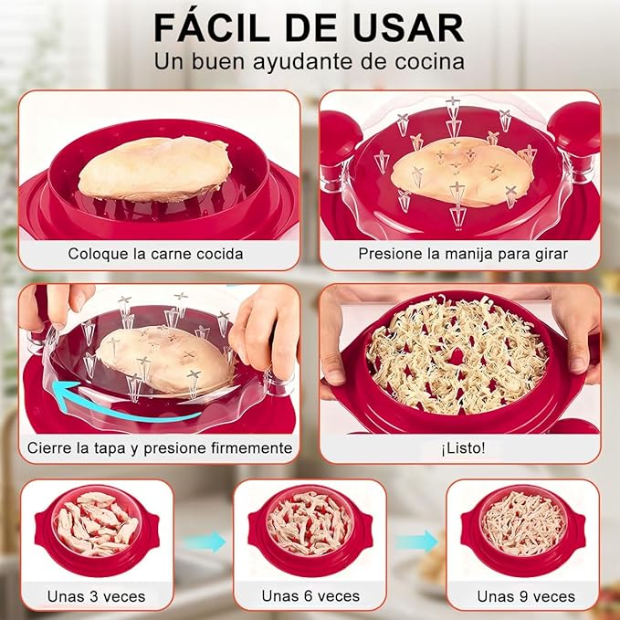 Herramienta manual diseñada para desmenuzar pollo, carne de res o cerdo de manera rápida y uniforme. Ideal para preparar tacos, tinga, ensaladas y múltiples recetas sin ensuciar ni maltratar los alimentos. Su diseño seguro y resistente permite ahorrar tiempo en la cocina y facilita la limpieza posterior.